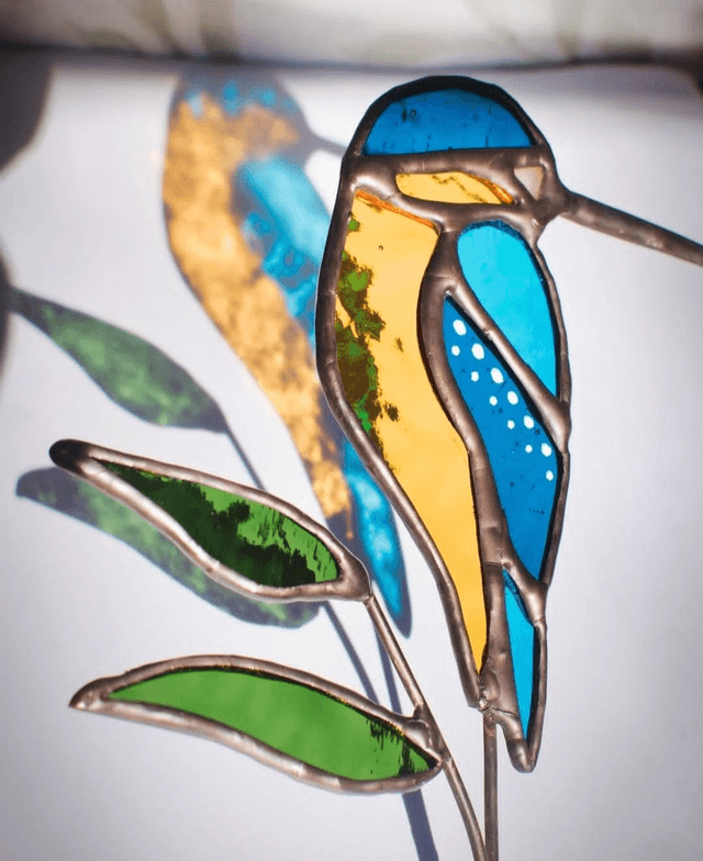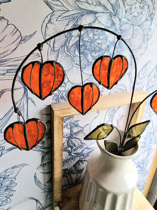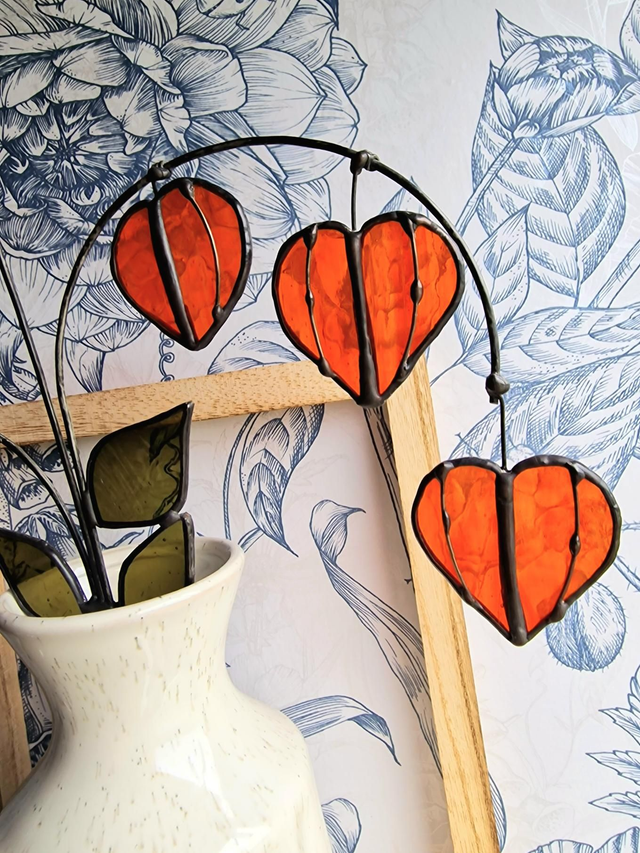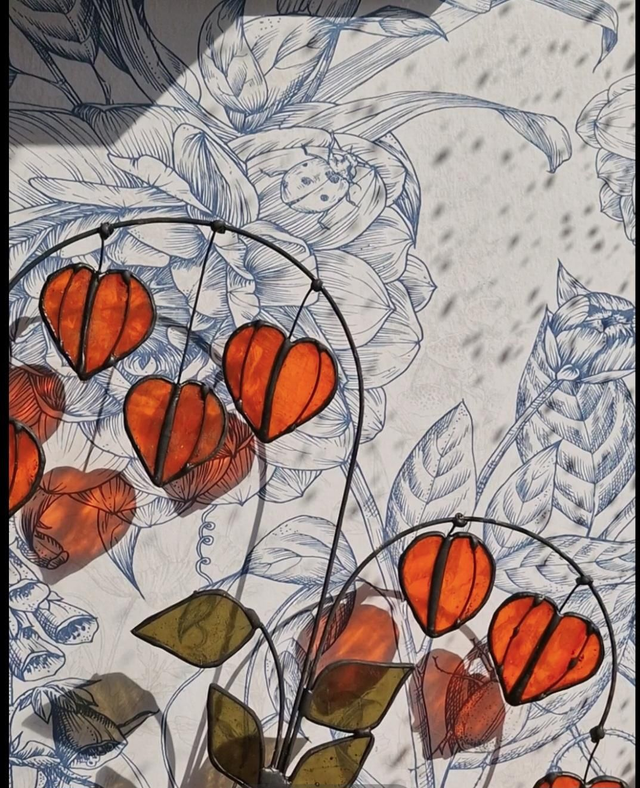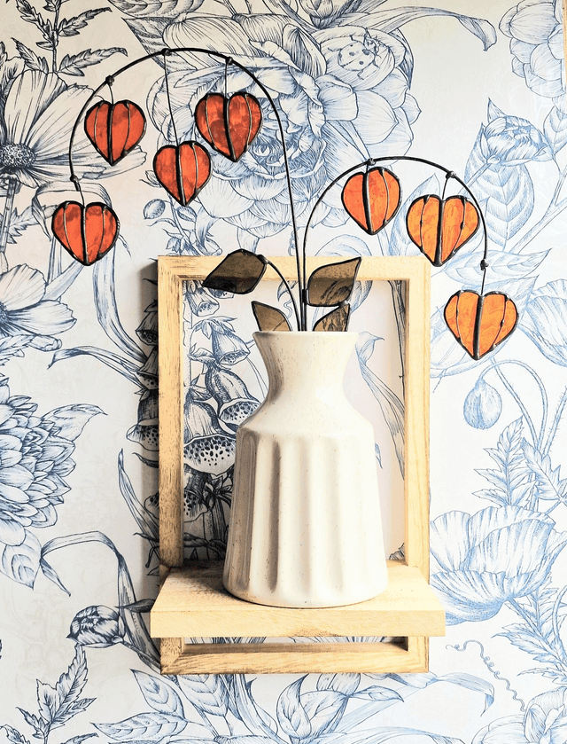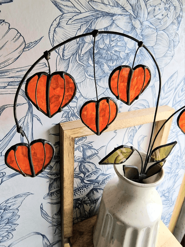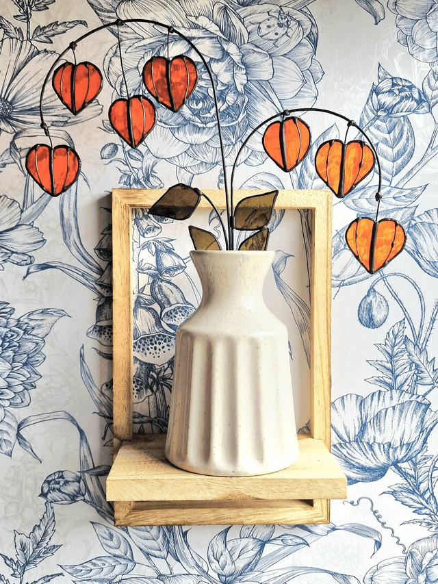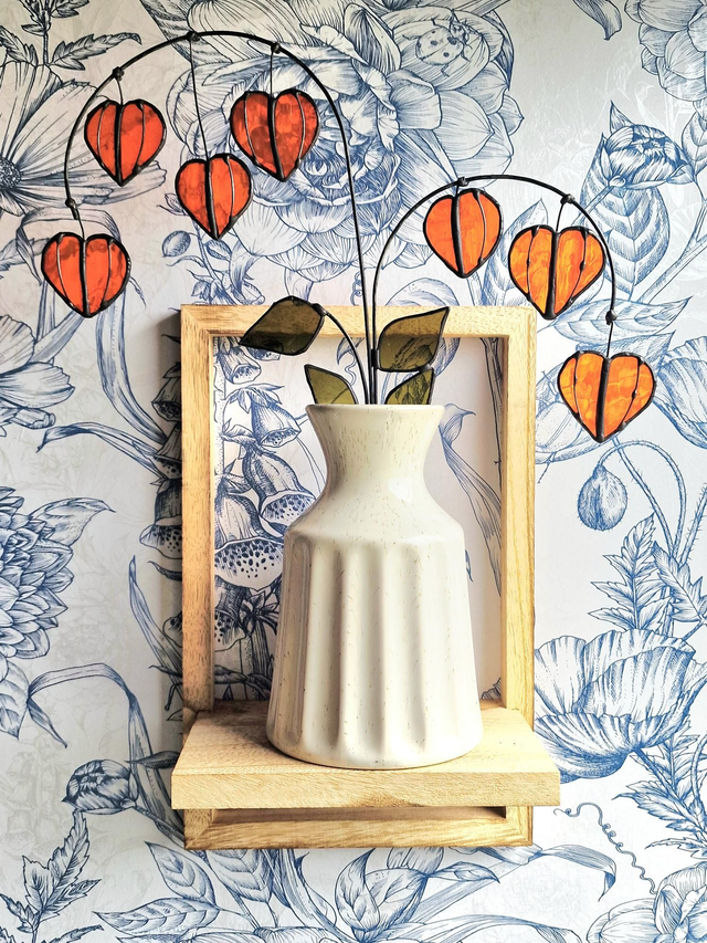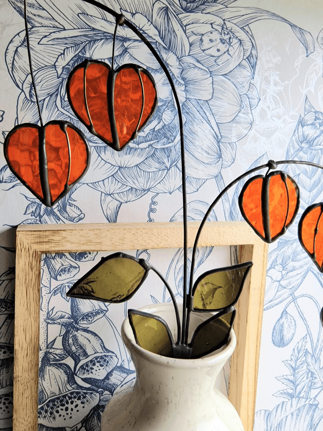 Elevate your home decor with our artisan handmade Chinese Lantern plant stem stained glass art piece.
